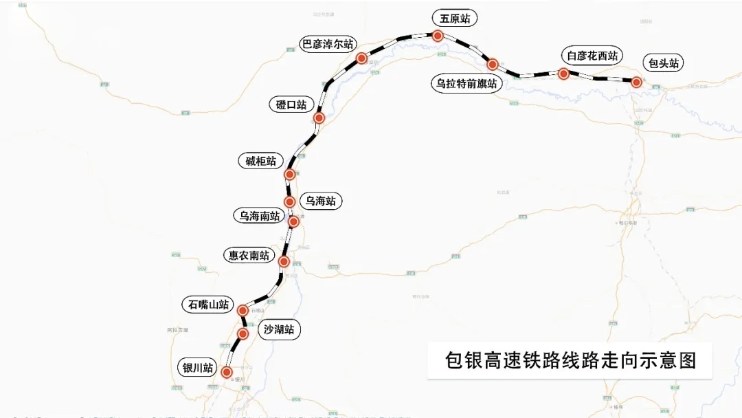 包银高铁起自包头站,经内蒙古自治区包头市、巴彦淖尔市、鄂尔多斯市、乌海市,宁夏回族自治区石嘴山市、银川市,接入银川站,正线全长519公里。其中,惠农至银川段全长97公里,已于2024年10月开通运营,此次开通的包头至惠农段全长422公里,共设包头、白彦花西、乌拉特前旗、五原、巴彦淖尔、磴口、碱柜、乌海、乌海南、惠农南10座车站,其中包头、巴彦淖尔、乌海、惠农南站为既有车站,其余车站为新建车站。